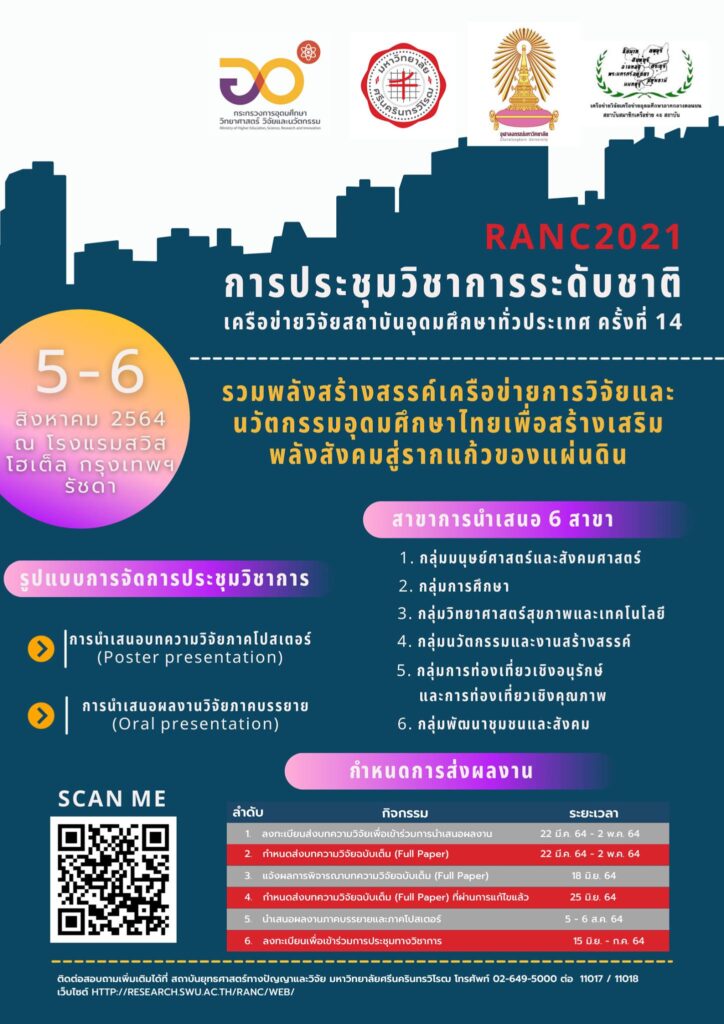 ระหว่างวันที่ 5-6 สิงหาคม 2564 ณ โรงแรม สวิสโฮเต็ล กรุงเทพฯ รัชดาเปิดรับลงทะเบียนและส่งบทความ ตั้งแต่วันนี้ – 2 พฤษภาคม 2564