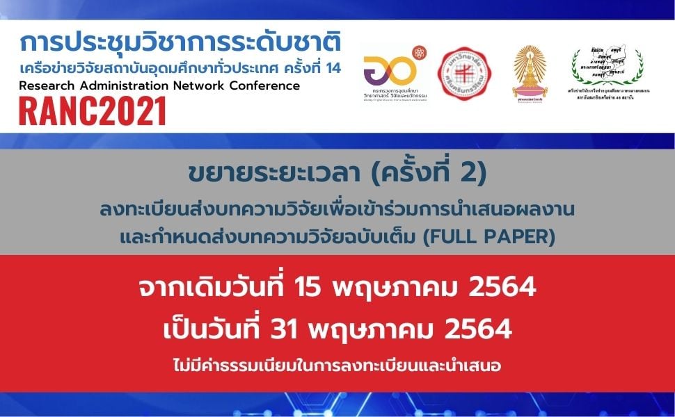ขอขยายกำหนดส่งบทความวิจัยฉบับเต็ม (Full Paper) ครั้งที่ 2 ถึงวันที่ 31 พฤษภาคม 2564