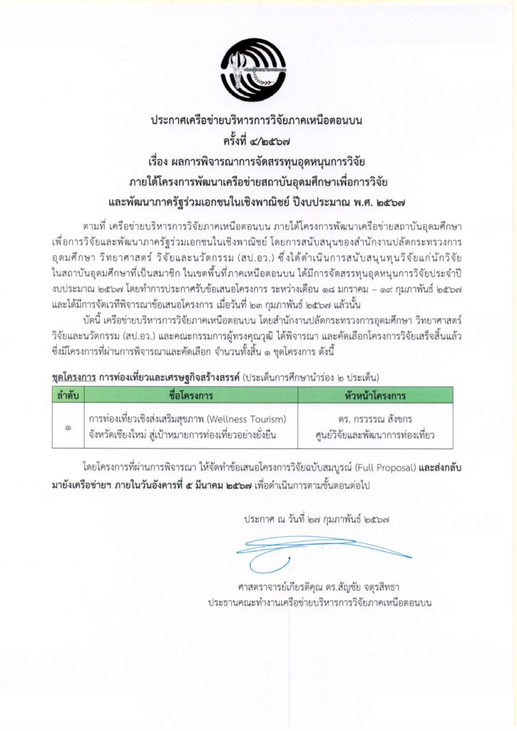 ประกาศ ผลการพิจารณาการจัดสรรทุนอุดหนุนการวิจัย ภายใต้ “โครงการพัฒนาเครือข่ายสถาบันอุดมศึกษาเพื่อการวิจัยและพัฒนาภาครัฐร่วมเอกชนในเชิงพาณิชย์ ประจำปีงบประมาณ 2567”