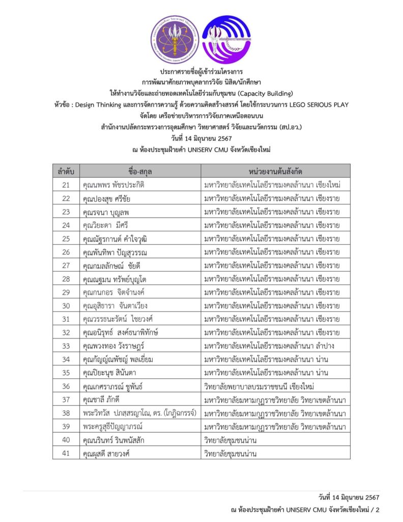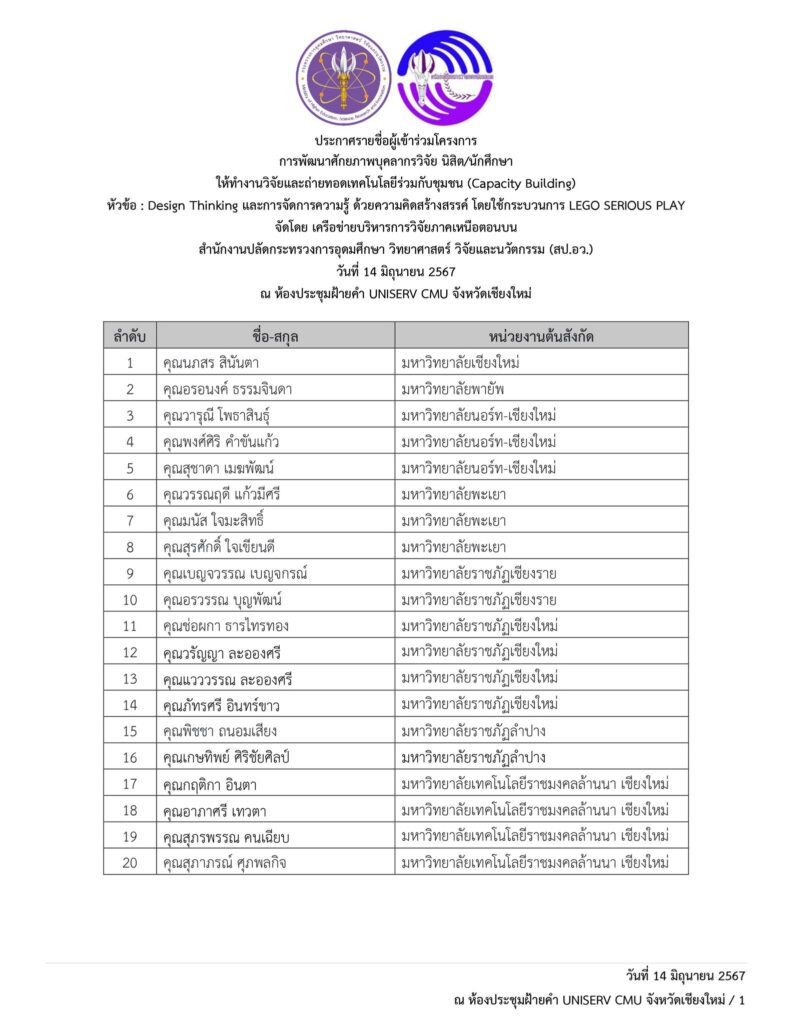 ประกาศรายชื่อผู้เข้าร่วมการอบรม “การพัฒนาศักยภาพบุคลากรวิจัย นิสิต/นักศึกษาให้ทำงานวิจัยร่วมกับภาคเอกชน (Capacity Building)”