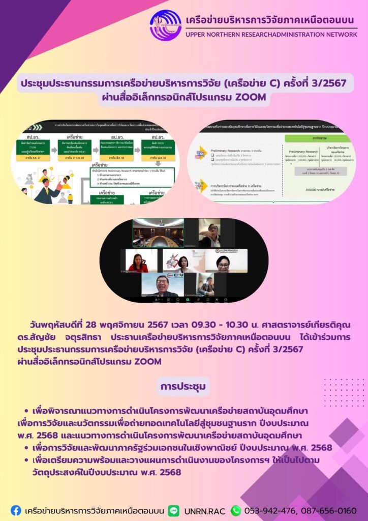 ศาสตราจารย์เกียรติคุณ ดร.สัญชัย จตุรสิทธา ประธานเครือข่ายบริหารการวิจัยภาคเหนือตอนบน ได้เข้าร่วมการประชุมประธานกรรมการเครือข่ายบริหารการวิจัย (เครือข่าย C) ครั้งที่ 3/2567 ผ่านสื่ออิเล็กทรอนิกส์โปรแกรม Zoom