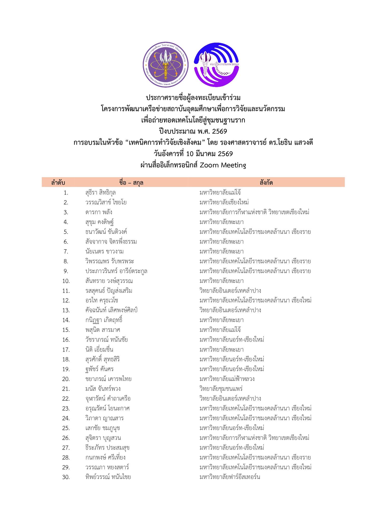 ประกาศรายชื่อผู้เข้าร่วมการอบรม “เทคนิคการทำวิจัยเชิงสังคม”