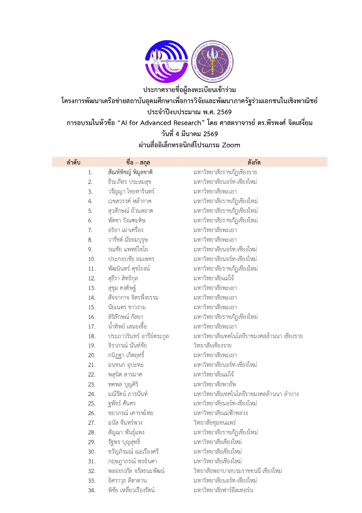 ประกาศรายชื่อผู้เข้าร่วมการอบรม “AI for Advanced Research”